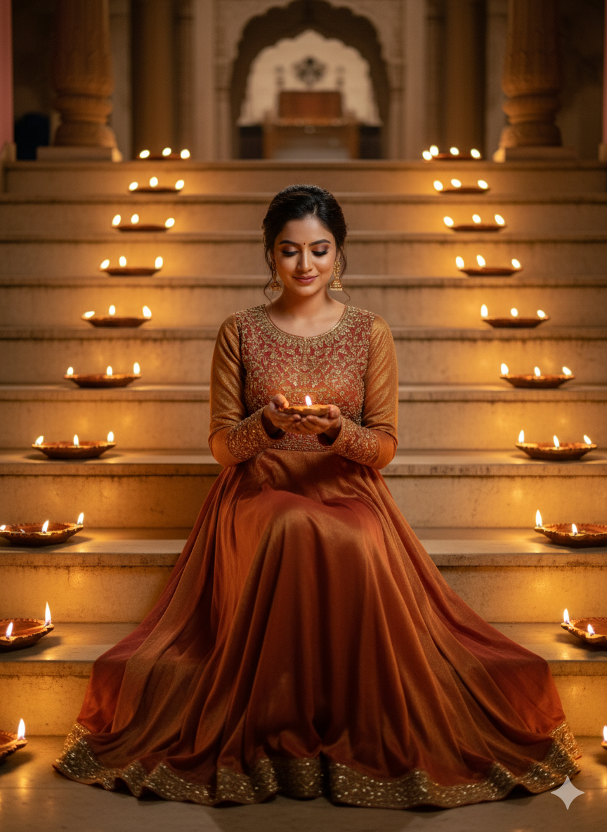 2. Ultra-photorealistic 8K cinematic festival portrait of an elegant Indian woman, perfectly face-aligned to reference. She sits gracefully on wide stone stairs at night, steps glowing with symmetrical trays of flickering oil lamps (diyas). Warm golden light surrounds her in a radiant halo. She holds a single diya delicately, lighting it with serene luminous expression. Wearing a golden-red Anarkali suit with thread embroidery on neckline and sleeves, softly shimmering fabric.
