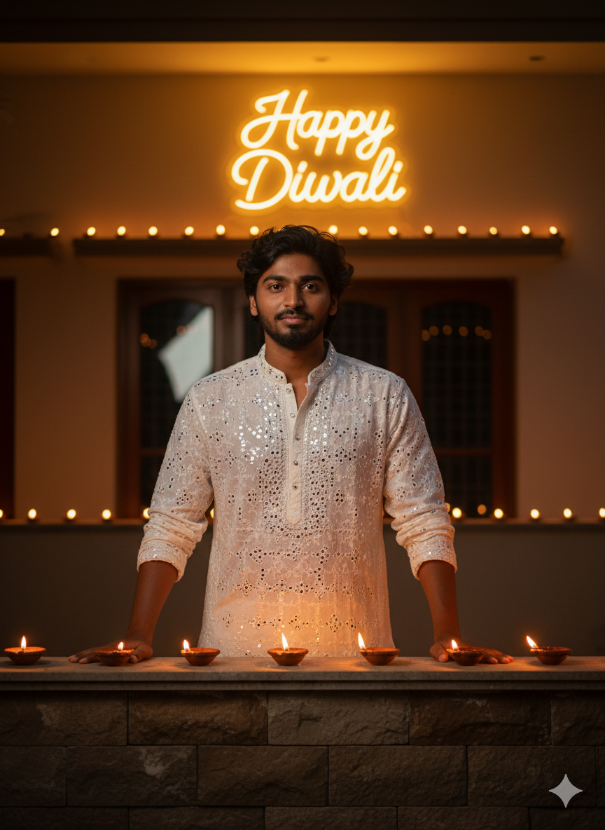 - Create an hyper realistic close-up full picture of a man matching attached photo, standing.on home terrace boundary, several diyas (oil lamps) lit along the edge, a house in the background with ‘Happy Diwali’ written in golden light on the wall, festive and warm lighting, realistic, high detail. Voluminous hair. Wearing a white mirror work semi-transparent kurta.