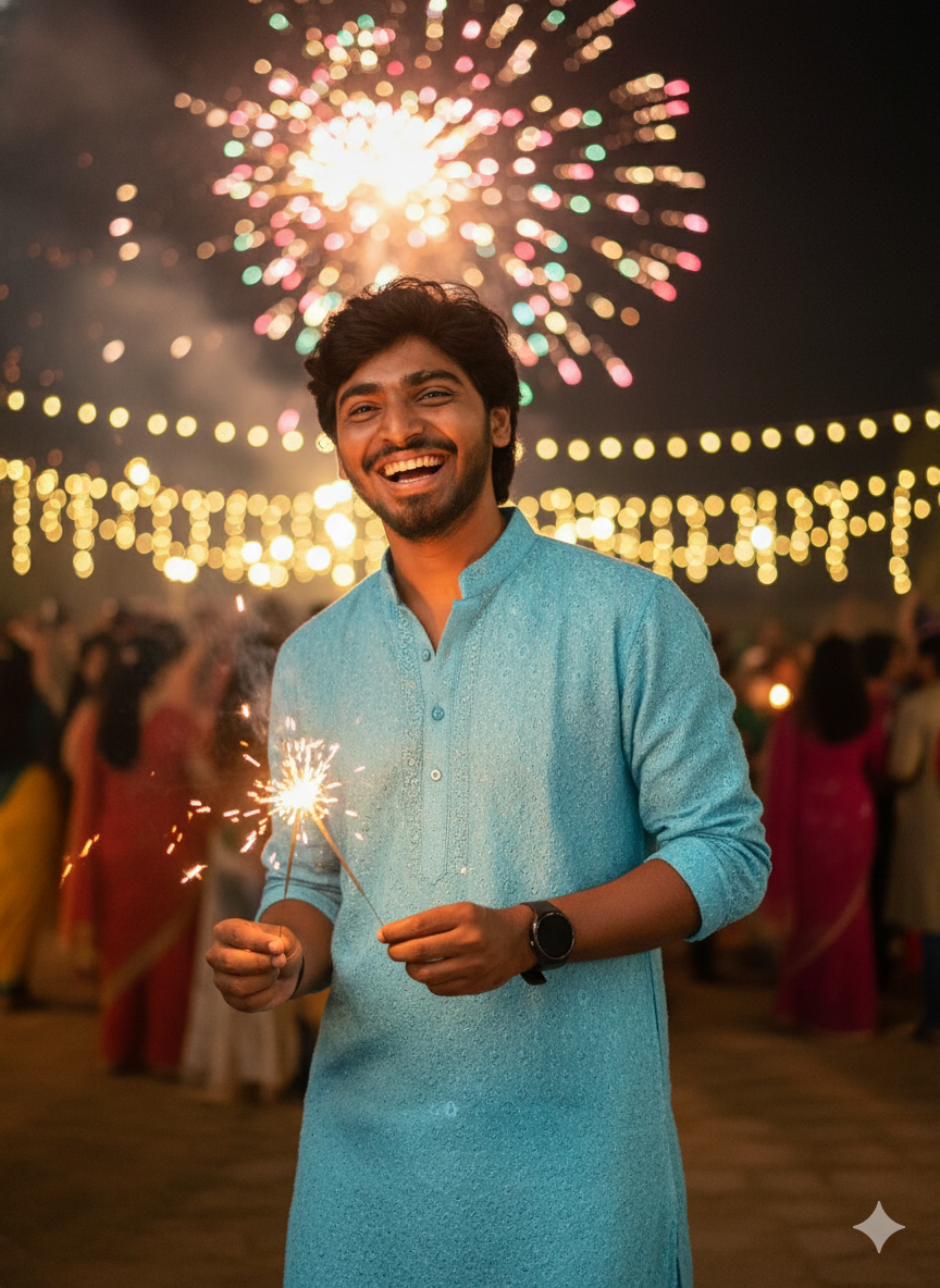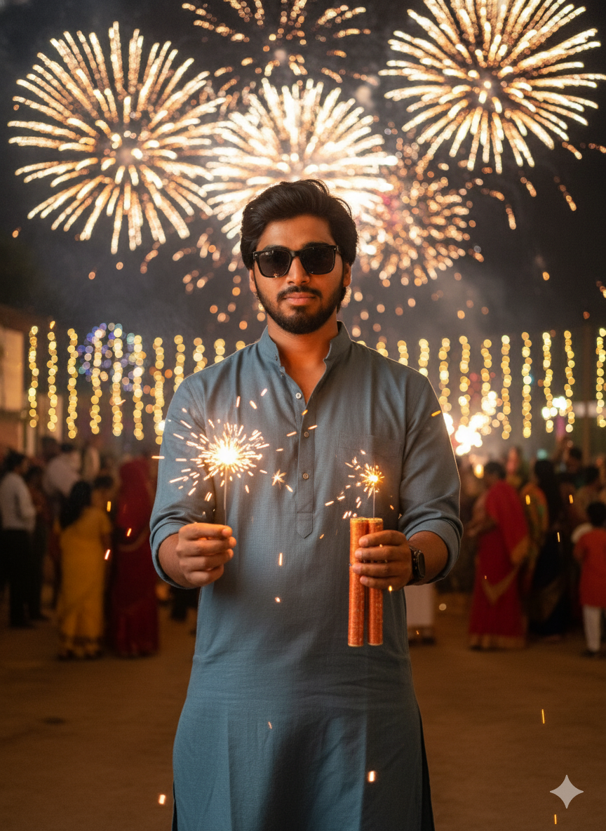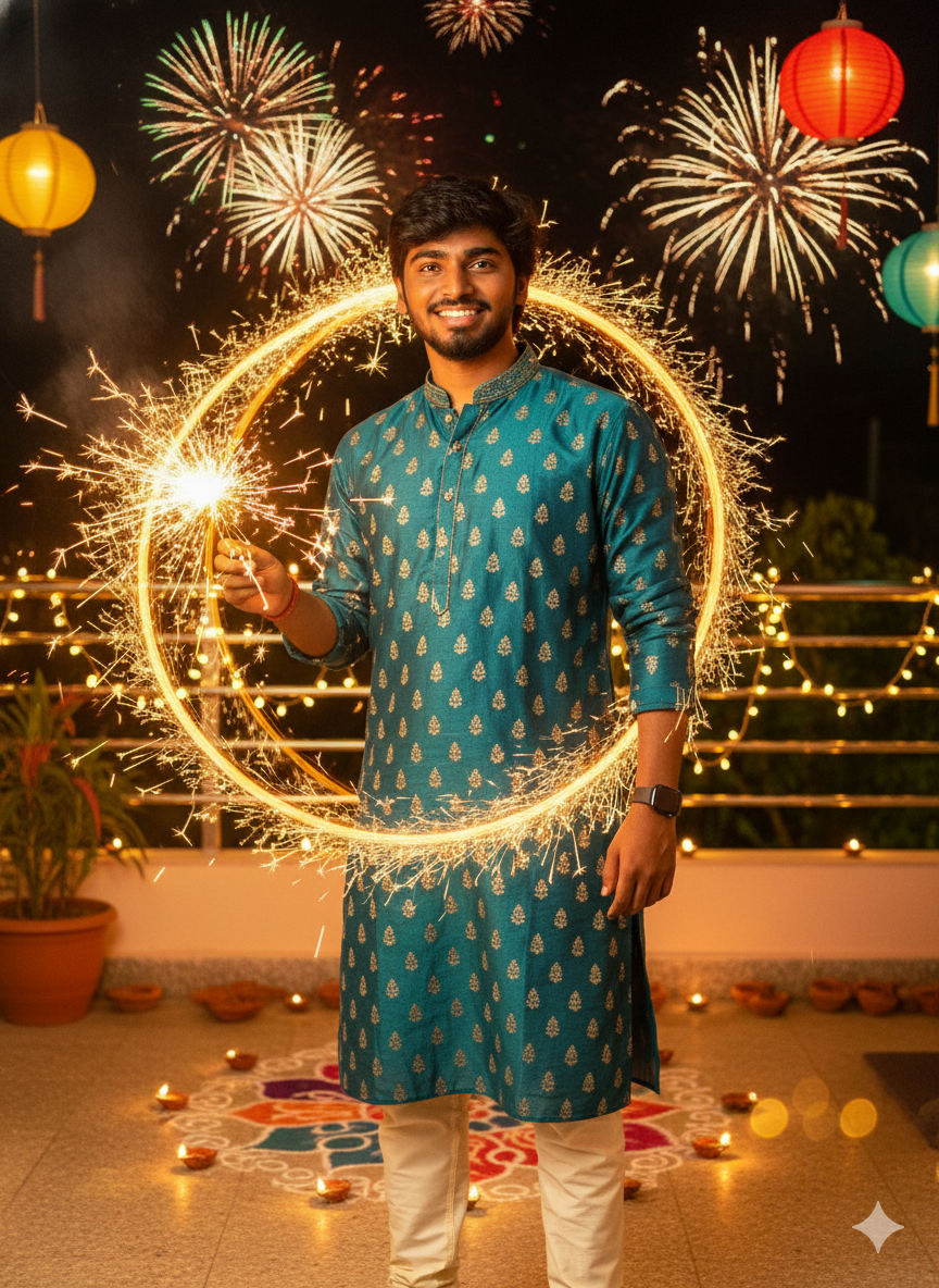 11. Ultra realistic festive Diwali scene. A young man stands confidently wearing stylish traditional clothes, holding a lit full chadi (sparkler)in his hand. The sparkler glows brightly, creating a beautiful golden ring of light around him as he waves it in the air. His outfit is vibrant and festive, with a shining designer kurta and pajama. In the background, there are colorful Diwali decorations, glowing diyas, fairy lights, and fireworks bursting in the night sky. The entire scene glows.