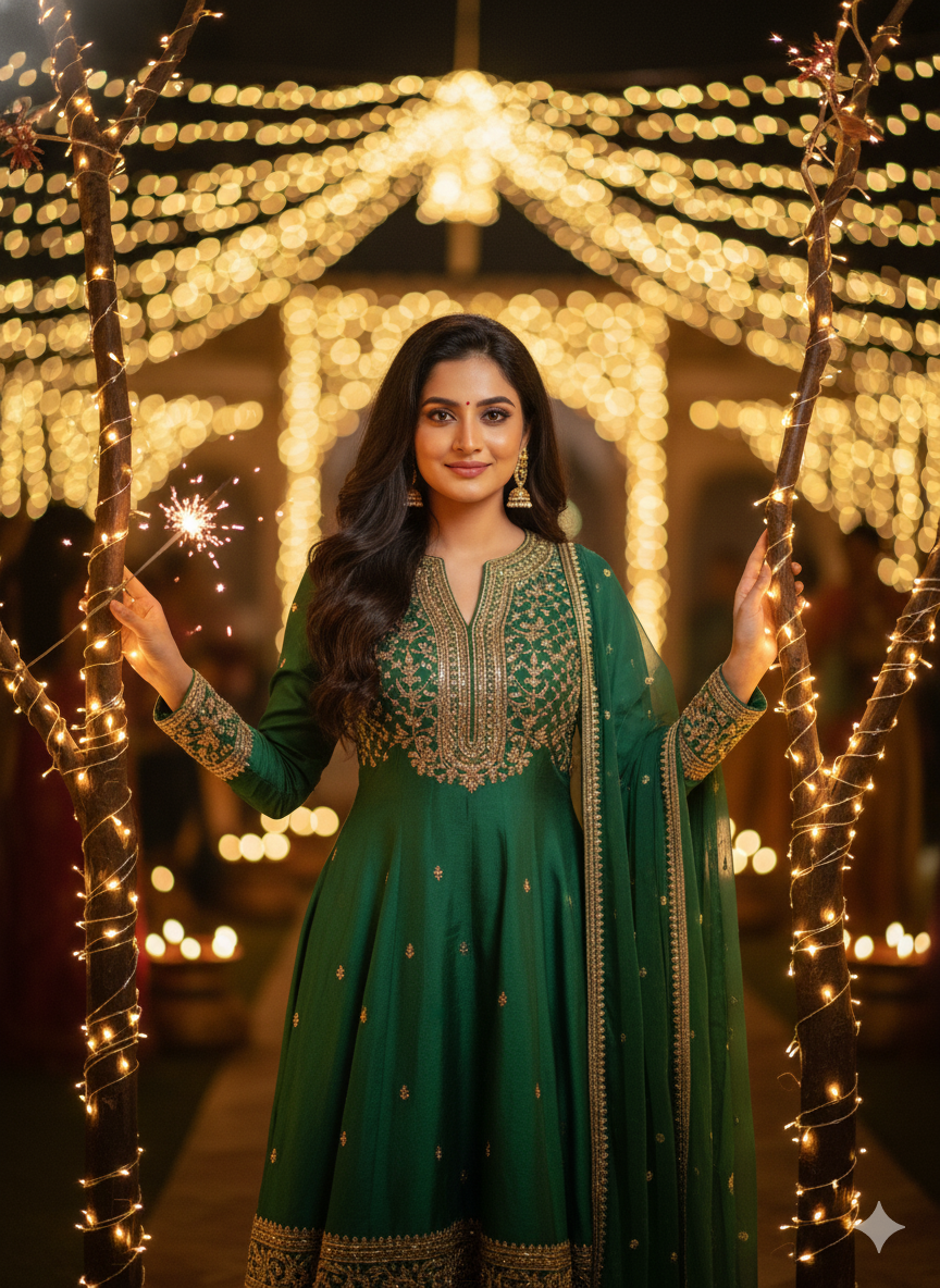 7. Ultra-photorealistic 8K cinematic festival portrait of an elegant Indian woman, Standing outside at night, with long black and brown hair loose, holding decorative tree branches wrapped in twinkling fairy lights. And with another hand holding a phuljari sparkling Make me wear a green salwar dress. And both hands are resting on the branches. The face should be exactly the same as in the photo