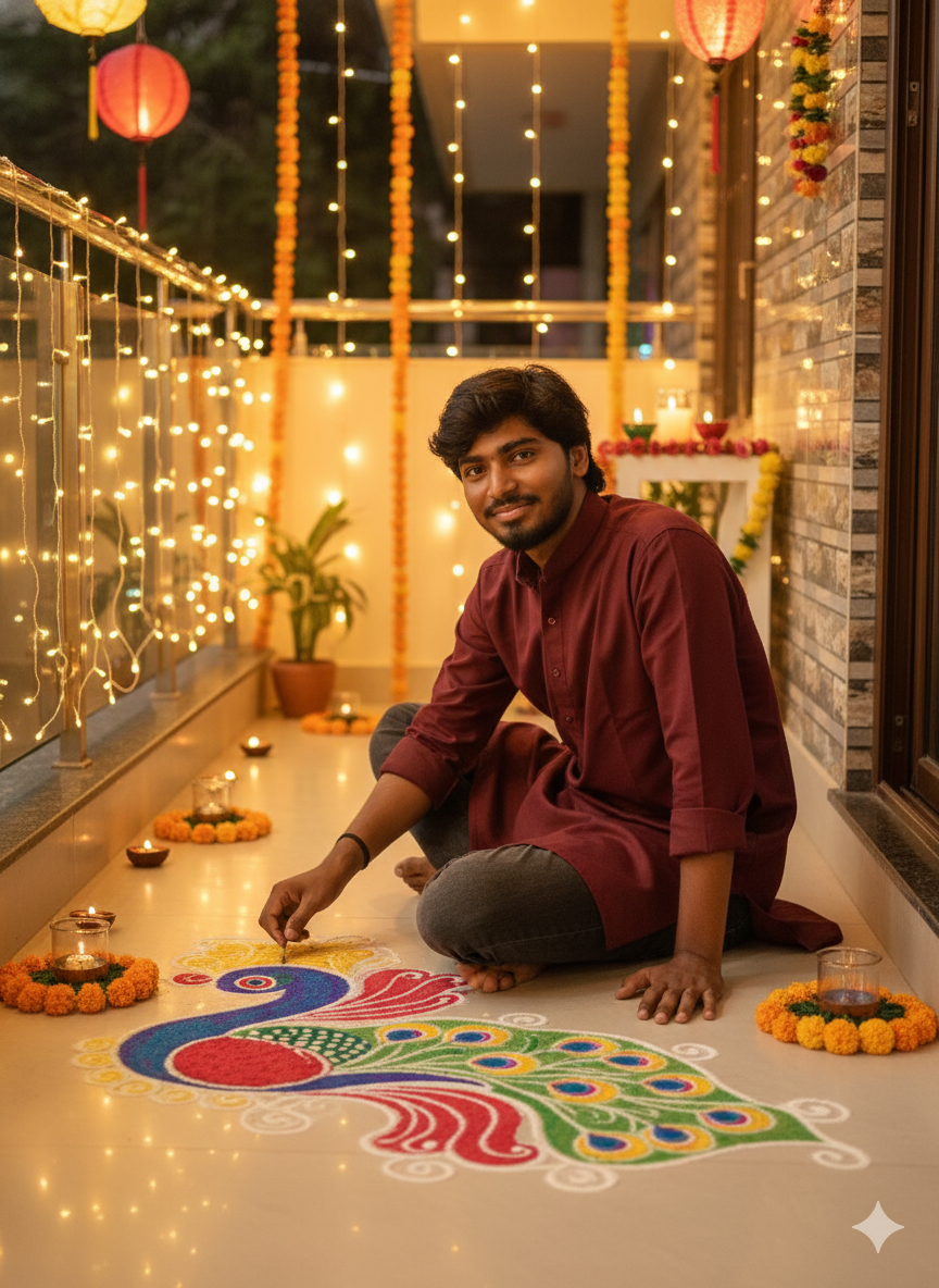 3. Create an Ultra realistic 4K HD Diwali festival scene, a young man (use my face)wearing a stylish maroon minimal traditional outfit, looking at camera, gracefully making peacock rangoli. His face must remain exactly the same as in the reference photo, no face change. Background is outdoor with a modern festive look- balcony decorated with fairy lights, lanterns, glowing candles, flower garlands, Warm golden cinematic lighting, natural skin tone, high quality.