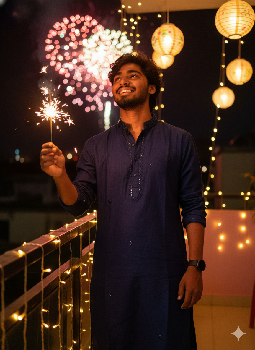 He is wearing a rich navy-blue kurta with fine mirror-work embroidery, paired with a round black smartwatch. Standing on a balcony decorated with fairy lights and lanterns, he smiles warmly holding a sparkler in one hand while gazing at the glowing skyline filled with bursting fireworks. Cinematic low-angle shot, dreamy golden and red tones, festive bokeh, shallow depth of field, ultra-realistic sharp textures, professional DSLR clarity. Make sure the face remains the same and 100% preserved.