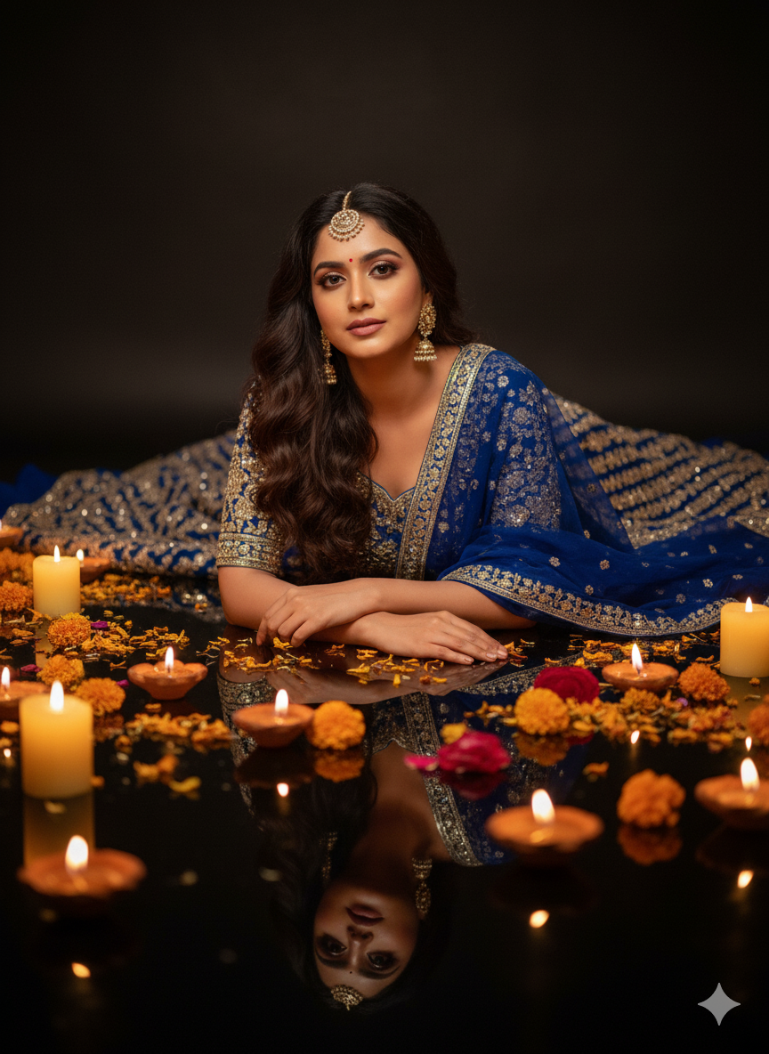 4. Create romantic cinematic portrait of a beautiful woman wearing a royal blue sabyasachi lehenga with sheer dupatta and heavy embroidery blouse with minimal glossy makeup and wearing kundan earing and mangtika. her hairs are loose wavy long.she is lying gracefully on a glossy black surface, hands are folded and put on the glossy black surface which is surrounded by many glowing earthen diya and flowerpetals marigold and rose and some candles. while warm diyalight highlights her delicate features and creates a dreamy reflection below. Ultra realistic, ethereal, high detail, 8K professional studio shot. 100% unchanged face should be same no alteration.