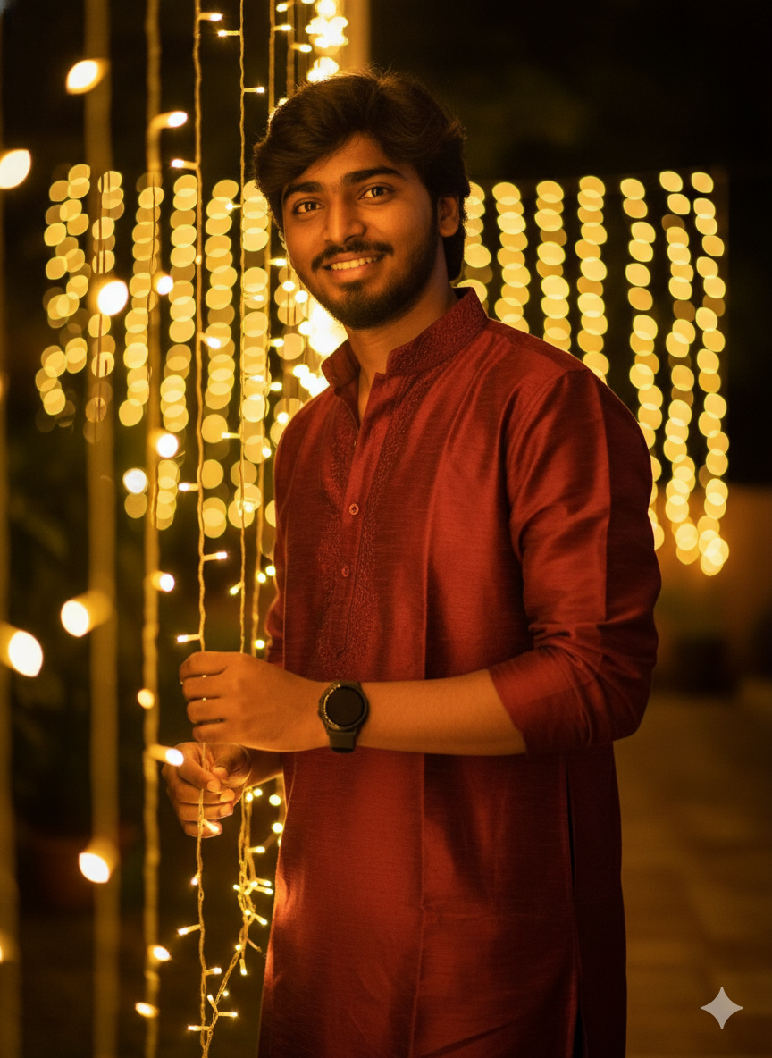 5. Ultra-realistic 8K DSLR festive portrait of the same young man (face must remain 100% identical to the reference without changes). He is dressed in a rich, deep maroon kurta with subtle embroidered texture, wearing a round black smartwatch. Shot waist-up, one hand rests lightly on glowing fairy lights while the other stays relaxed by his side. He gives a wide, confident smile, looking directly at the camera. The background is filled with soft, glowing diyas (lamps), blurred fairy lights, and warm Diwali bokeh for a rich, festive ambiance. Cinematic low-angle framing, natural skin tones, sharp, realistic textures, professional 8K DSLR clarity.