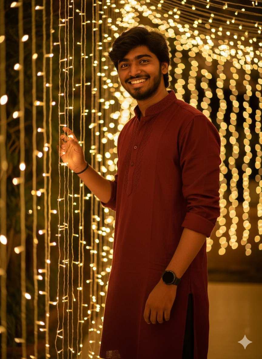 10. Ultra-realistic 8K DSLR festive portrait of the same young man (face must remain 100% identical to the reference without changes). He is dressed in a rich deep maroon kurta with subtle embroidered texture, wearing a round black smartwatch. Shot waist-up, one hand rests lightly on glowing fairy lights while the other stays relaxed by his side. He gives a wide confident smile, looking directly at the camera. The background is filled with soft glowing diyas (lamps), blurred fairy lights, and warm Diwali bokeh for a rich festive ambiance. Cinematic low-angle framing, natural skin tones, sharp realistic textures, professional 8K DSLR clarity.