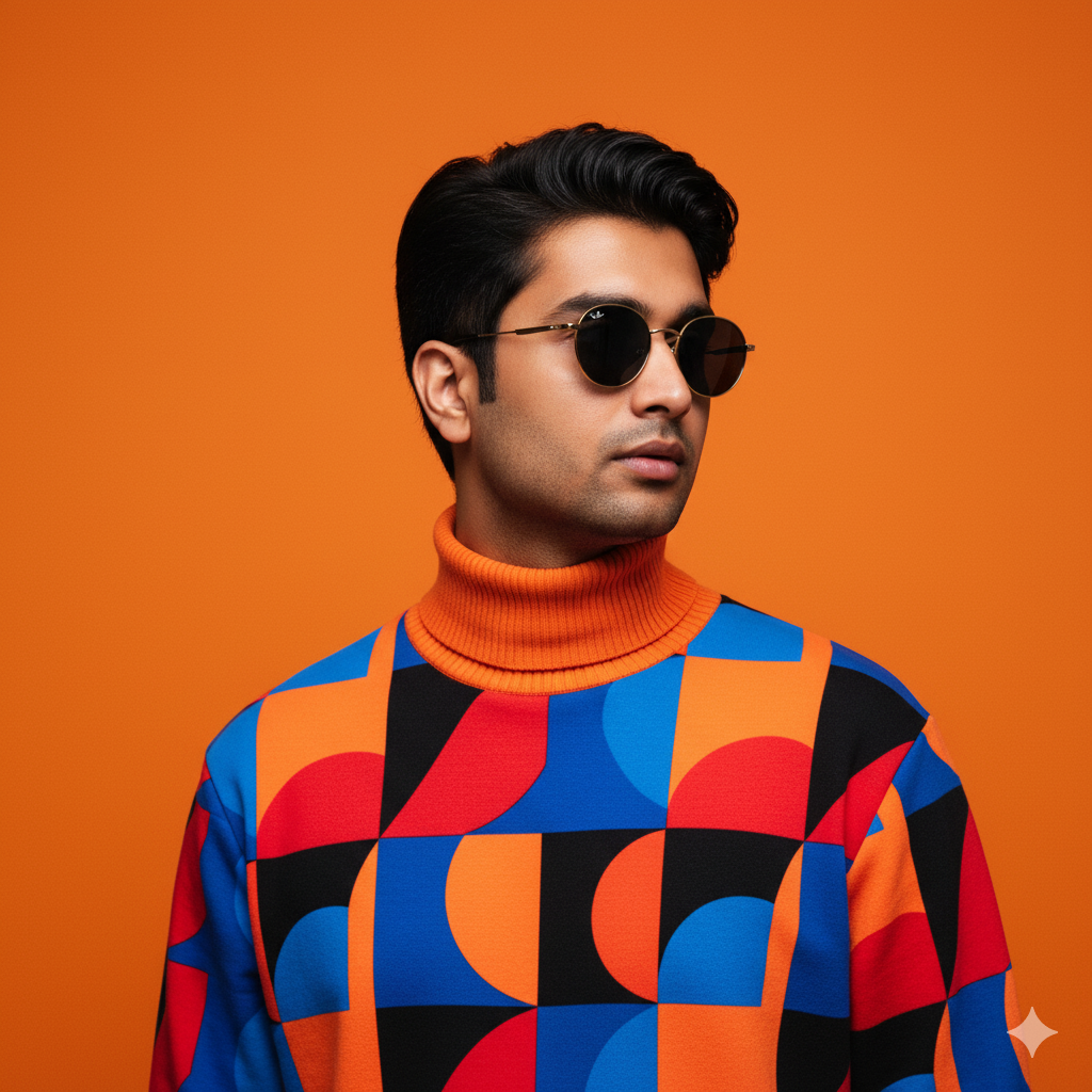 Ultra-realistic 8K fashion portrait of a male model with the same facial features and hairstyle as the reference image, wearing round black-and-gold sunglasses and a bold geometric-patterned sweatshirt with a thick orange ribbed turtleneck. The pattern features vivid orange, blue, red, and black shapes. He looks confidently to the side under bright, cinematic studio lighting against a solid vivid orange background, creating a sleek, modern, and editorial aesthetic.